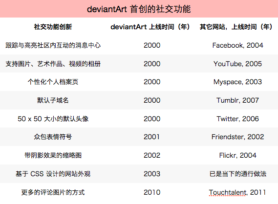 从网站设计上看,deviantArt 略显老态,不如后来者 Dribbble 那么简约、轻灵。但它绝对是社交网站潮流的先锋,下面是一张表格,许多现在社交网站所具备的元素,其实是重复了 deviantArt 走过的老路。