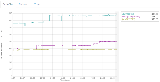 Google 设计 Dart 的目的是在 JavaScript 语言的基础上,改进编程效率和软件执行效率,并减少大型软件的编程复杂性。而从 Google 提供的 Benchmark 评分来看,它确实做到第一点, Dart 编写的程序执行效率比 JavaScript 高出 42%到 130%。