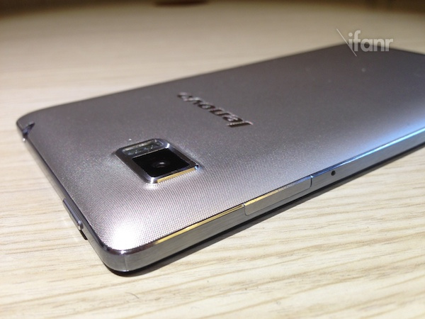 机身背盖目测是复合纤维,而非 K900 的金属材质, 不过手摸上去质感还不错,暂时不知道联想用了什么加工工艺。(更新:根据官方资料,VIBE Z 上的 “流光背壳” 采用了微米级激光精细镭雕工艺)。