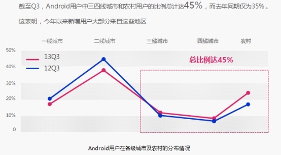 总体而言,国内 Android 用户的成熟度在不断提升,整体增速逐渐放缓。不过,来自三、四线城市以及农村的用户开始展现出蓬勃的增长势头。第三季度新增加的 3700 万 Android 用户中,来自农村和城市打工族的用户比例将近六成,目前三、四线城市和农村用户已经占据整体 Android 用户的 45%。