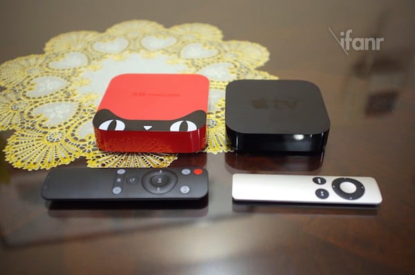 天猫魔盒明显比 Apple TV 大一圈,后者结构明显更紧凑