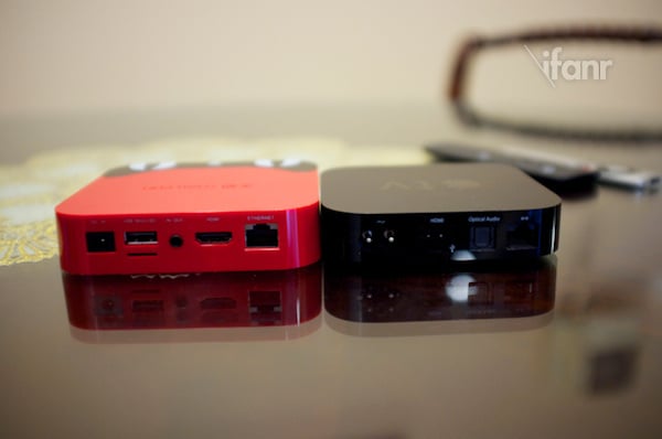 而机身后的接口也比较丰富,从左至右分别是电源、全尺寸 USB、MicroSD、A/V、HDMI 以及以太网接口。和 Apple TV 对比的话,前者多了全尺寸 USB、SD扩展、照顾老旧设备的 A/V 视频音频输出,但少了后者的光纤音频输出,算是定位上的不同。