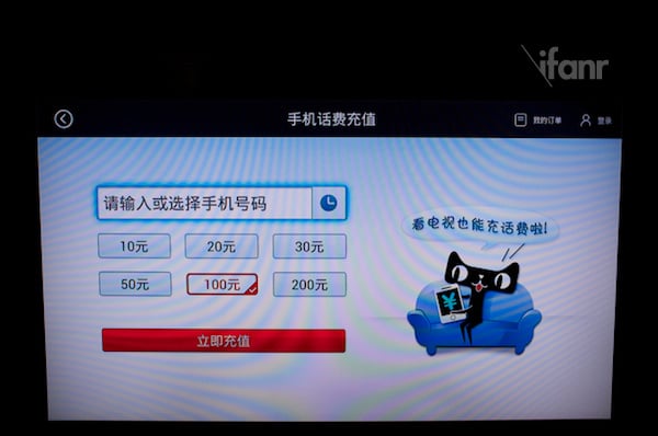 至于单独拿出来说的 “购物”,则是天猫魔盒的主打内容,也可以说是与其他同类产品最大的差异点之一。除了置入了如“聚划算”、“天猫超市”等阿里旗下购物入口外,还提供了一些日常支付项目上的方便,如手机充值、水电煤缴费、以及彩票购买等。