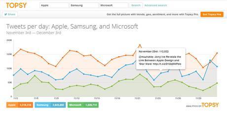 一个最简单的例子如下,利用 Topsy 的服务可以进行一个简单的查询,追踪最近有多少的 Twitter 条目提及了厂商,同时也可以把竞争对手的数据同时展示出来,下图中的橙线表示苹果,蓝线表示三星,绿线表示微软。