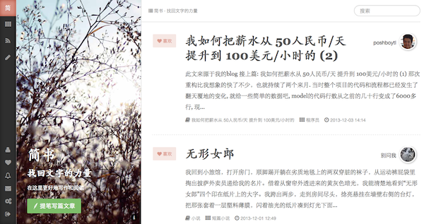 而从 Maleskine 到简书,用林立的话来讲,则是由一种自然而然的需求所驱动。“我写完了长文,自然就有发布的需求,所以当完成写作工具的产品,下一个要完成的功能就是发布。而你知道像 Evernote 这样的工具,作者是可以新建多个笔记本的,所以很自然作者发布出去的文章,就可以有一个或多个文集。所以,当时我们想象产品未来发展的时候,会觉得(简书)是一个很好的作者文集发布的平台。”