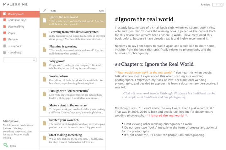 当时林立做了一些市场调研的工作,一个是从自己出发,如果有一个类似 Evernote 这样的笔记本产品支持 Markdown 语法,他自己“一定愿意去用”,另一方面,他做了简单的市场调研,则发现那时候市面上,没有一个产品的形态是和 Maleskine 相似的。——尽管支持 Markdown 的工具也挺多的,但都是编辑器,而非笔记本的形态。