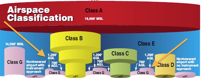 即使 FAA 管不着,但是无人机的飞行区域也应该是有限制的,按照 FAA 的规定,空域被分割成不同的监管层,从 A 类到 G 类不等。从距地表 18000 英尺到 60000 英尺的领空属于商用飞机飞行的 A 类监管层,机场周围的空域按照机场的大小和城市的大小被分为 BCD 类不同,而属于低空的 700 到 1200 英尺领域则属于 G 类监管层。E 类则是 60000 英尺以上的高空和其他空域。