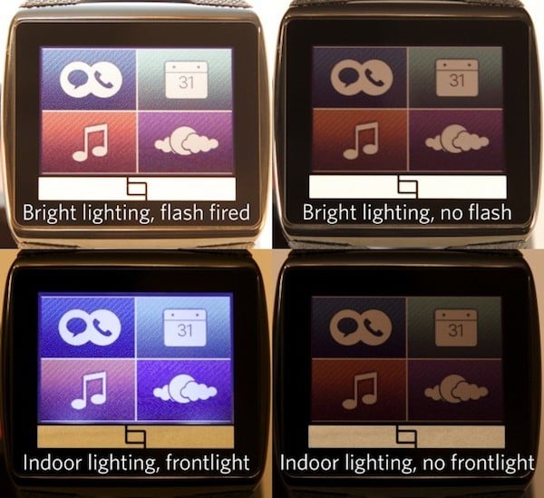 从 Toq 的显示效果来看,Mirasol 屏透光不均匀,显示效果较为模糊,色彩管理也不够出色。不过,在日光下, 它能够让你阅读到手表上的内容,而不必用手遮挡阳光,或眯着眼睛来看。但在室内环境或是夜晚,Mirasol 屏幕的亮度就会降低。和传统的 LCD 腕表一样,它也配备了辅助光源,就是为了应付光线条件不好的情况。