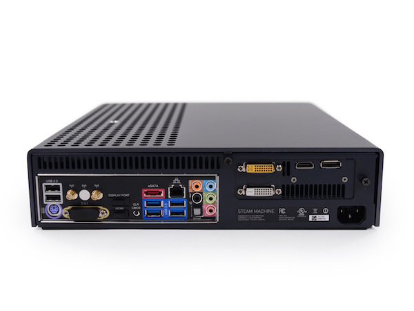 拆解主菜前先看看背面。和其他游戏主机测试机一样,测试版的 Steam Machine 也为开发者预留了阵容强大的各种接口,几乎一网打尽所有主流的输入、输出接口了。分别有: