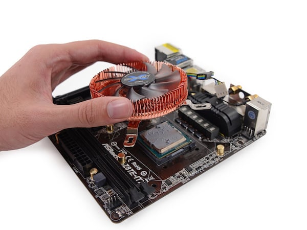 Steam Machine 的主板比想象中要小,是一块 Mini-ITX 主板。板上装在了两条容量为 8GB 的 DDR3 12800 内存,然后坐落在一旁的是一门巨大的风扇(Zalman CNPS 2X Mini-ITX CPU cooler,据说非常安静),风扇下则是主机的心脏 Intel Core i5-4570,这是一枚四核四线程的桌面级 CPU,拥有 6 MB 缓存,最高运行频率为 3.6 GHz。虽然采用的是 22nm 工艺,但 84W 功率也很好解释散热风扇的体积了。