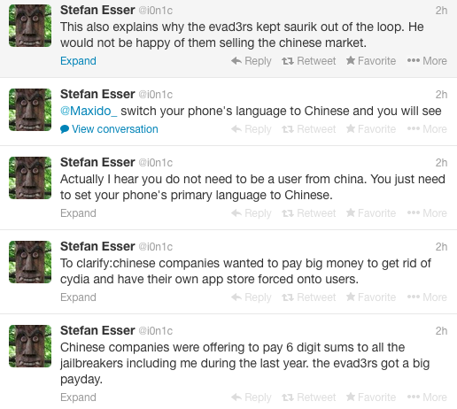 这让我想起了前不久的一条新闻,当时 iOS 越狱界的一员,安全专家 Stefan Esser(@i0nic)发 Tweet 称 eva3drs 开发的 iOS 7 越狱工具被窃,并已经卖给了一个私人卖家(private buyer)。今晚 Stefan Esser 再次爆出猛料:早在去年,就有中国公司就试图通过六位数的报酬说服越狱黑客(jailbreakers)在越狱工具里去掉 Cydia,并给用户的手机强制装入他们的应用商店。