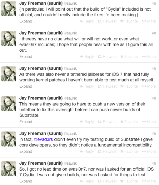 随后,Cydia 之父 Jay Freeman(@saurik)发 Tweet 表示:evasi0n7 内置的 Cydia 版本并非官方释出,而且没有包含他目前正在制作的修复补丁。换言之,Cydia 之父对此次越狱工具的放出毫不知情。