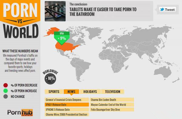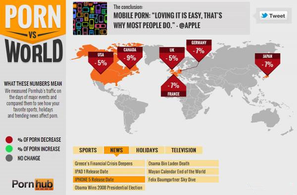 上图是去年 iPhone 5 发售日部分国家浏览色情内容的监测记录,很巧合的,这些国家的浏览量有着不同程度的下降,或者说,他们需要抢更快更新的手机看片儿。