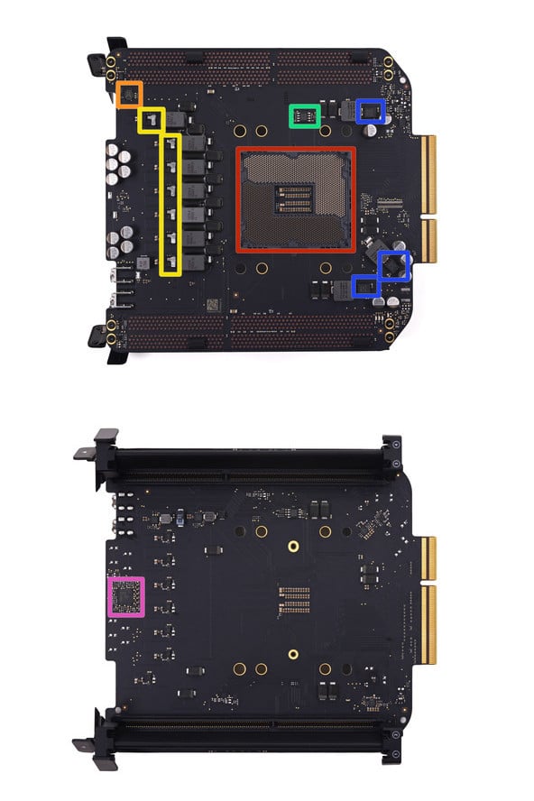 拆掉处理器的主板有其他的一些元件。红色是 LGA 2011(R插槽)CPU 插槽;橙色是 SMSC 1428-7 3233E5A;黄色是 IR C F3575 3X3YP;青色是 NXP PA9517A 电平转换 I2C 总线中继器;蓝色是德州仪器 58872D。