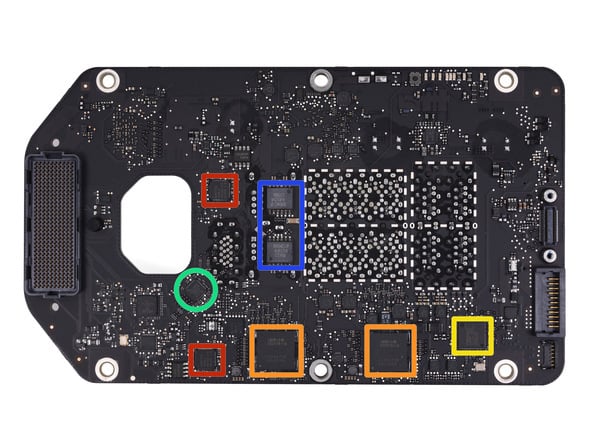 把显卡部分拆下,就下下面这个样子。红色部分是 AMD FirePro D300 显卡处理器;橙色部分是Elpida W2032BBBG 2 Gb (8 x 2 Gb = 16 Gb = 2 GB) GDDR5 VRAM;黄色是 Intersil ISL 6336 6 相位 PWM 控制器。