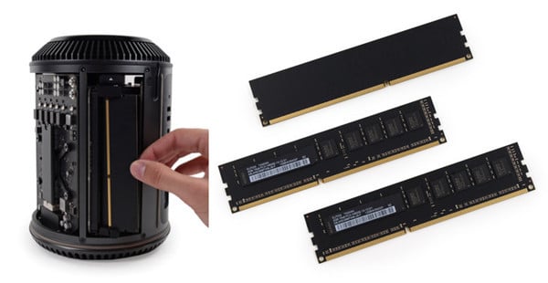 稍微换个方向,就可以看到 Mac Pro 所使用的 Elpida EBJ04EG8BFWB-JS-F 4 GB DDR3L 内存条了,每条 4 GB,3 条共计 12 GB 的内存。好消息是内存条很容易卸下,也很容易装上。