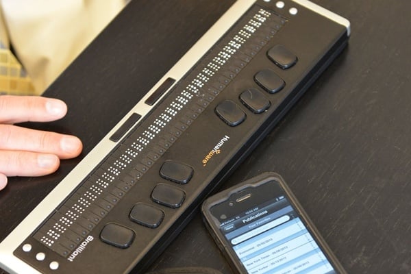 Humanware 生产的配套盲文阅读器可以与 iPhone 相连,通过 BARD Mobile 接入的文本内容会在阅读器上显示为盲文。这些文字能够随着手机上的文本内容实时刷新,盲人们触摸阅读器表面就可以读书了。