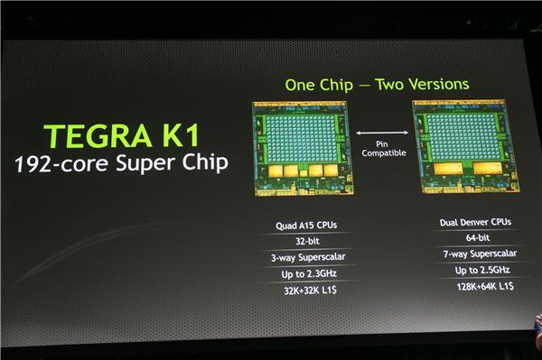 黄仁勋现场公布 Tegra K1 将拥有两个版本。一是32 位,基于四核 Cortex-A15 设计的版本,一是 64 位,基于 Nvidia 自行开发的 Denver CPU 的版本。前者运行频率最高达 2.3 GHz,后者运行频率最高达 2.5 GHz。