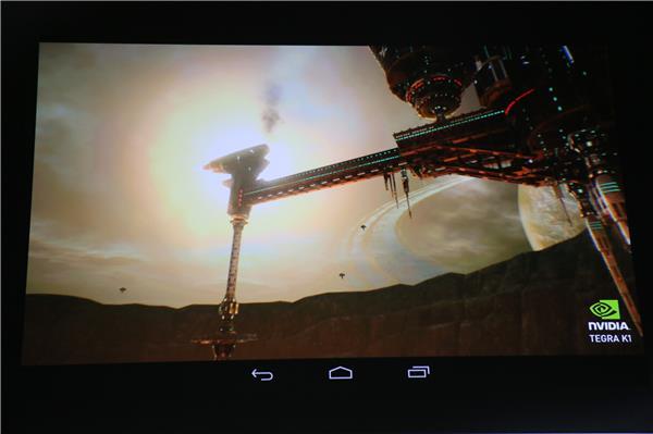 为了展示 Tegra K1 的性能与特性,黄仁勋拿来一部平板电脑,显示一个实时 3D 渲染的人像。从画面上看,人像的眼神就好像活的一样;皮肤上的毛孔、雀斑还有坑坑洼洼,都十分清晰;环境光在皮肤上的反射也十分真实。让人印象深刻的是, 当黄仁勋改变环境光源的时候,人像上发亮的鼻子。