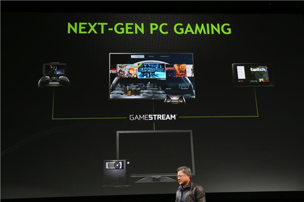 Shield 的这个新功能,背后是英伟达推出的新技术 Gamescream。如下图所示,它的作用是连接不同的设备,让游戏画面随处显示。通过该技术,电脑上的游戏可以投射到电视上,也可以投射到 Shield 上;而 Shield 的游戏画面也可以投射到电视上或电脑上。