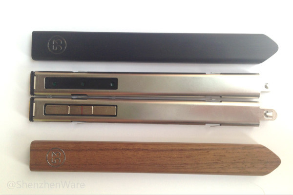因为要把龙骨固定到外壳上,所以在铝合金或者核桃木的外盒内部,都有车削的卡槽。通过金属龙骨上的两个卡扣卡住 Pencil 外壳。整个外壳设计没有一个螺丝钉。