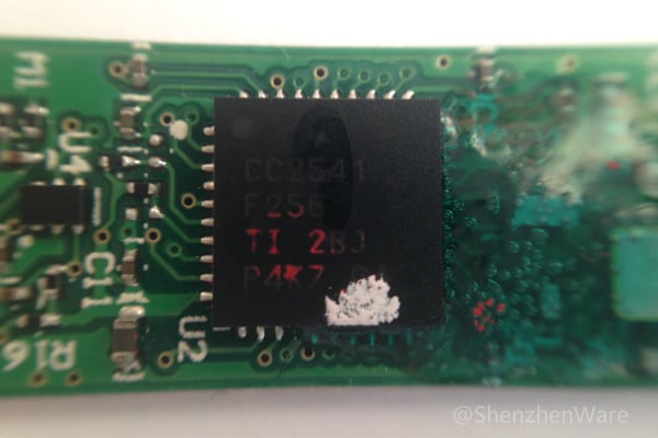 把螺丝刀伸进金属龙骨,拧开里面的螺丝,取下真正的“笔芯”,用塑料外壳固定的电路板。我们发现了 TI 的支持 2.4GHz 蓝牙低能耗芯片,支持蓝牙 4.0 BLE。