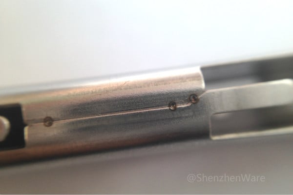 石墨黑的 Pencil 外壳为铝合金制作。笔杆的外壳采用整块铝锭挤压、铣削出来,类似如 MacBook Pro 的一体成型(Unibody)的工艺,这样的结构减少了零件数量,提高了装配精度。仔细观察,还可看到 Pencil 外壳的内侧与外侧同时做了阳极氧化。