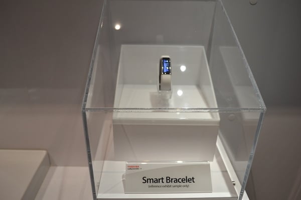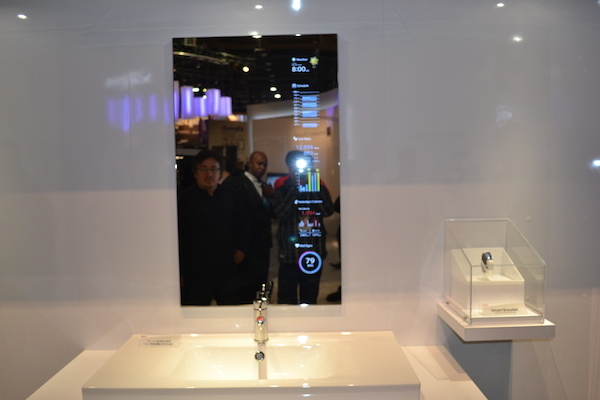 如果说笔记本和电视是东芝的老本行的话,东芝也在积极拥抱智能家居和可穿戴设备,下面的“智能镜子”配备了显示功能,可以显示天气信息,还可以和运动手环连接,显示相关的运动数据,应该是会具备提醒功能。。