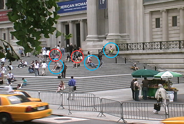 按照 Project for Public Spaces (PPS)方法,Hampton 和他的学生在纽约、波士顿和费城架起摄像机观测公共空间,通过 2008 年到 2010 年 3 年间的积累,Hampton 收集到了 9173 段 15 秒的视频素材,总计时长约 38 个小时。Hampton 和其学生总共用了 2000 小时的时长来分析素材中人物的特征,即性别、组织规模、是否闲逛和手机使用。