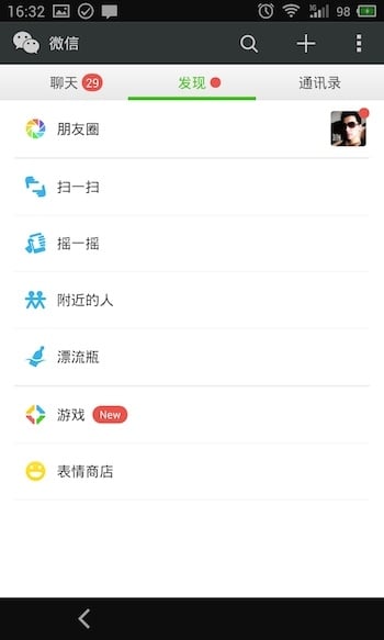 现在,三个主界面的按钮如今放置在界面的上方,而且没有突起的按钮,而是采用了变色、色条的方式来提醒用户按钮的存在。操作方式也从过去的“点按”变为“滑动”。换言之,现在我们在微信上左右滑动,就可以切换界面。