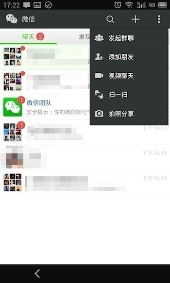 现在微信的按钮集中在右上角,有代表搜索的“放大镜”、代表常用操作的“+”号和还有更多设置。