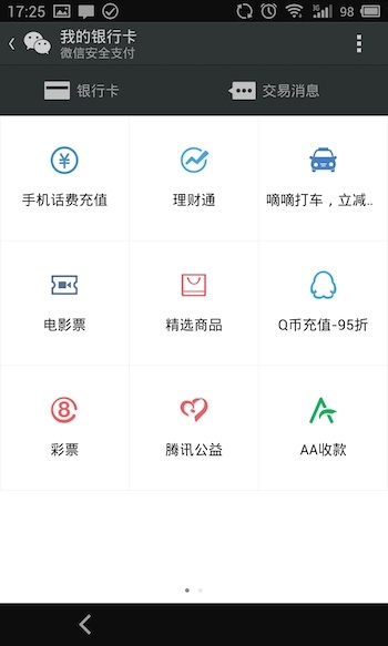 “我的银行”这个界面,过去很像 Passbook,采用了卡片式设计。现在则和“订阅号”里一样,将各个功能、服务的图表平铺在上。