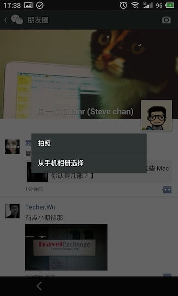 朋友圈里,点击“相机”,和过去一样,弹出“拍照”和“从手机相册选择”两个选项。但不同的是,过去这两个按钮被放在一个面板里,从下往上弹出;现在则是直接在屏幕中间弹出两个按钮。从操作的便利程度来说,我宁愿不要改。