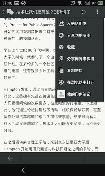 对微信推送的文章的操作也集中在界面右上角,这是操作逻辑的变化。