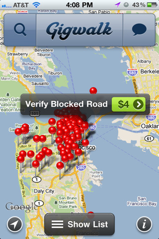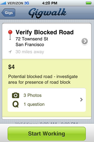 公测 6 周后,Gigwalk 正式在苹果程序商店中发布并免费下载。软件有点像游戏中的工会/任务看板一样,用户可以选择某一项临时工作,譬如收集和反馈某些真实的数据给任务提供者,获得单笔 3 至 90 美元的报酬,每月上限 1600 美元。