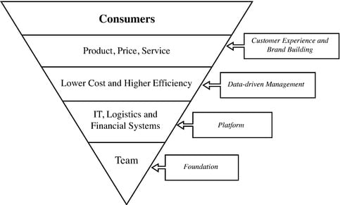 中国最大的线上直销公司。京东强调了自己的规模优势,这能令它以竞争力的价格为消费者提供种类繁多的商品,并吸引更多第三方进驻。此外,庞大的用户基数与订单数量,让京东可以创建不断增长的消费者数据库。以此为基础,京东可以改进库存管理、促销管理、针对性营销。对消费者的行为以及偏好的深刻了解,京东得以藉此顺利扩充新的产品品类,引进新产品。