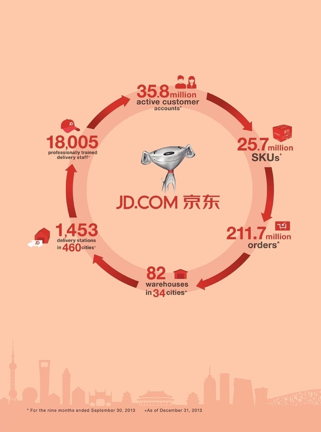 根据京东的招股说明书,截至 2013 年 9 月,京东活跃用户为 3580 万,2570 个存货单位,完成了 2.117 亿个订单;在 34 个城市设有仓库,460 个城市里拥有 1453 个配送站,一共有 18005 名经过专业训练的配送人员。