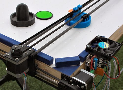 原因是 Julio 的爱女很喜欢那种游乐园里面的桌上冰球游戏,为满足女儿心愿的 Julio 灵机一动:步进马达、驱动器、轴承、控制机械部件运作的电路板、甚至是运送喷头的传送带都已经集齐了,以上这些原本为 3D 打印而设的部件,同时难道不也是桌上冰球机器人的基本材料?