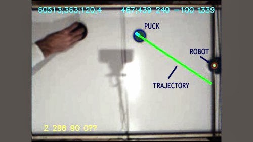 对于一部合格的冰球机器人来说,需要透过摄像头拍下两个特定帧数内冰球的位移,从而计算出冰球的轨迹,而且对于桌上冰球来说,还需要考虑到球撞击到墙后的运动轨迹,所以这花了这位黑客爸爸的一些功夫。