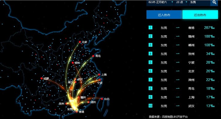昨夜盛传一张关于东莞的图片,是基于百度地图 LBS 开放平台的百度迁徙项目的东莞人口迁出图。在 CCTV 曝光东莞性交易内幕之后,不少互联网从业者搬出东莞当天人口迁移的示意图(点击可放大)。大致如下: