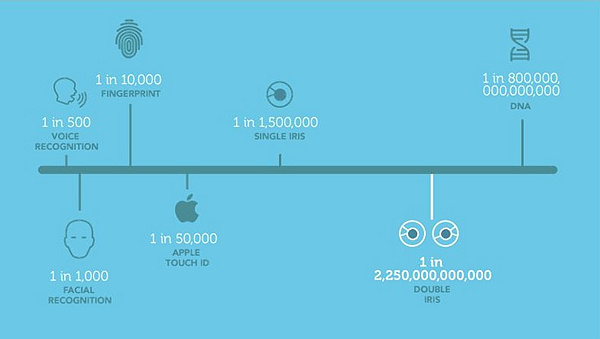 所以还是得在安全措施上想出路,类似苹果 Touch ID 就是个不错的想法。此外,一家来自纽约的安全公司 EyeLock 也在尝试用更先进的生物密码来代替传统密码,他们的武器是虹膜扫描。