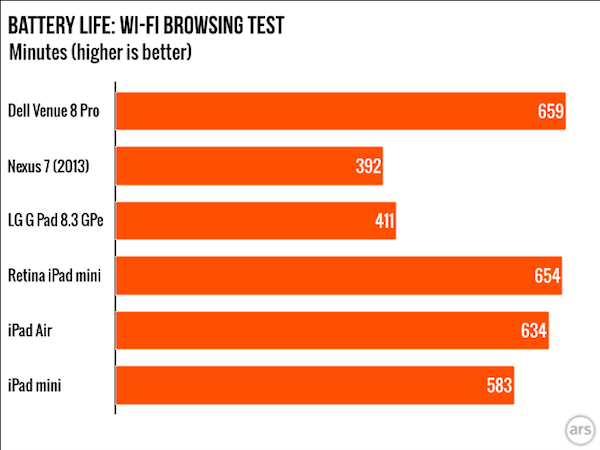 不过最让人惊讶的并非 Bay Trail 核心的性能,而是其优秀的功耗。在横比测试中,所有设备屏幕亮度在 50% 情况下不断装载网页,Venue 8 Pro 甚至以轻微的优势击败了以长续航著称的 iPad Air,得出了 11 小时的成绩。虽然并不算是一个全面的测试,但至少说明,Atom + Windows 8 的组合,并非耗电的代名词了。