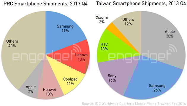 在 IDC 提供给 Engadget 的最新数据中,大中华地区手机出货量在大陆和台湾之间有着十分大的差异。
