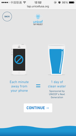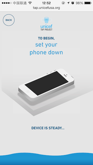 方法非常简单,在你的手机浏览器进入这个网页:uniceftapproject.org,按照指引进入挑战,这时候程序会要求你的手机放在平面并开始计时。这段时间内,只要你不拿起你的手机一分钟,UNICEF 就会为贫困地区的儿童提供一天的干净饮用水。