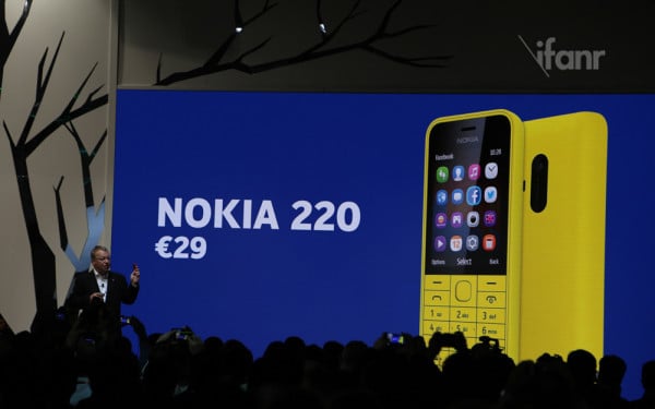 不过发布会最早发布的确是一款低端功能机诺基亚 220,售价 29 欧元起,预装了 Facebook 和 Twitter。