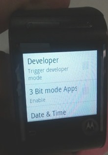 从这张图来看,手表屏幕占据的面积并不算大。在摩托罗拉 Logo 的另一侧依稀可以看到一个后退触摸按键,而屏幕上方似乎也有两个长条型的按键,尚不清楚有什么作用。屏幕显示的开发者模式和日期时间比较好理解,而 3 Bit mode Apps 就不知道是什么意思了。Android Police 猜测可能是和应用在屏幕显示颜色的接口有关。