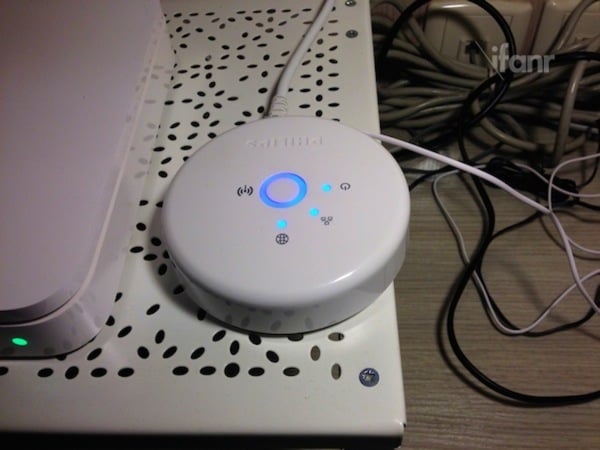 组装 hue 非常简单,当你将灯泡拧入灯筒(E27 大头),其实差不多已成功了一半。和普通灯泡唯一的不同是,你需要将白色的 bridge 连接家中的路由器(下图),同时通过扫描二维码将 hue 客户端下载到你的智能手机/平板上,然后即可完成与中控的配对(具体安装方法请点这里)。