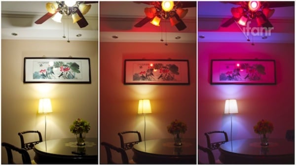 用户可透过 iOS/Android 设备(注:Android 客户端在不久的将来即将上线),便可因应喜好与室内环境随意对灯组实现远程的调控,每颗灯泡内含了三种颜色的 LED 芯(红、蓝、青),色温可从从冷到暖任意切换,因此理论上共可调配出 1600 万种颜色。