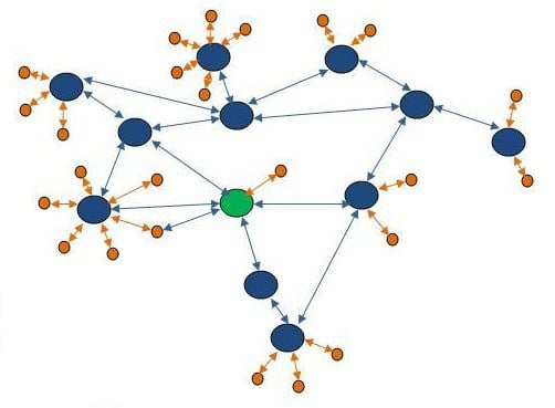 Zigbee 这种技术相对 WiFi 的好处是,一方面功耗只有后者的 1/10,另一方面 Zigbee 采用的是网状网络呢(mesh network), 这种技术不会只是单点传递信息,而是每一个灯泡都能互相沟通(如下图例),因此这样能够靠灯泡来扩大网络范围,减少环境局限与中控的压力。节能与稳定的 Zigbee,是智能家电的一个非常好的解决方案。