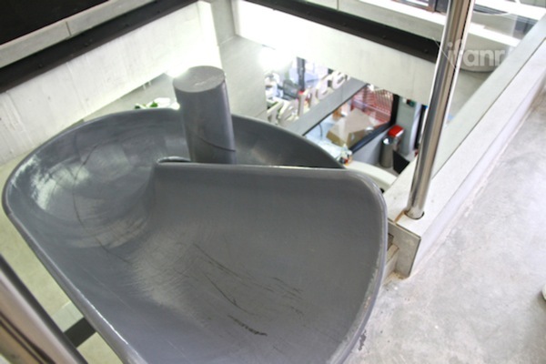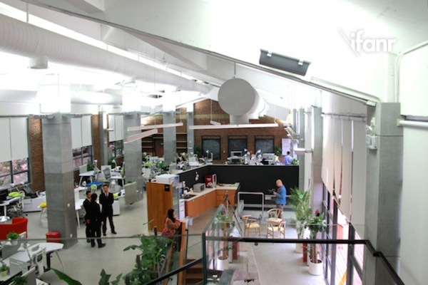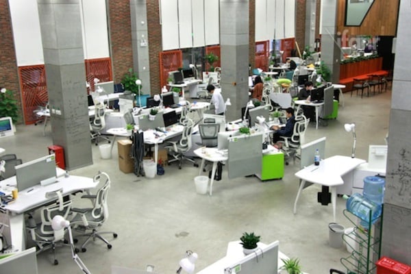 工厂的楼高很高,因此整个办公空间分为三层,但是从楼上两层依然能看到整个一层的布局。微信研发部采用了开放式设计,员工的办公环境、厨房、会议室都没有明显的阻隔。其实这里的布置风格并不是 “办公室” 而更像一个大型的创业团队。其中一个细节非常有趣,就是微信成员旁边的柱子其实都是一块块黑板,成员的即兴想法都能随时写在上面。(出于保密,黑板的内容就不公开了)